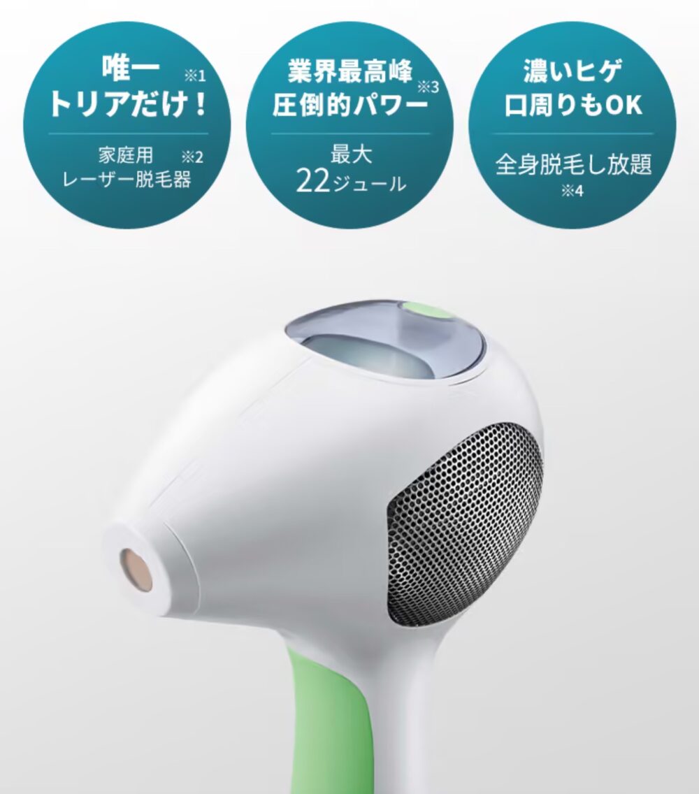 トリアはヒゲやVIOなど毛の濃い部分にピンポイントで使用し、腕や足など広い面積の部分は(そこまで高出力が必要ないので)他の脱毛器を使うというのも選択肢になりそうです。